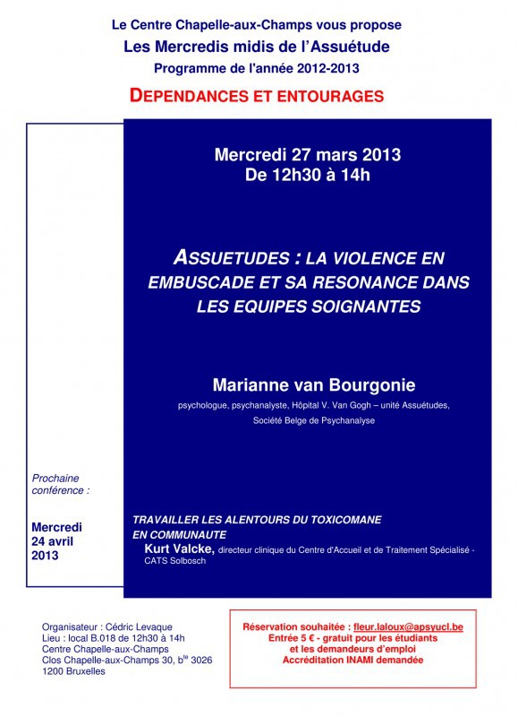 L'Unité Assuétudes du Centre Chapelle-aux-Champs vous propose une conférence sur le thème : "Assuétudes, la violence en embuscade et sa résonance dans les équipes soignantes" de Marianne van Bourgonie, le mercredi 27 mars 2013, de 12h30 à 14h.