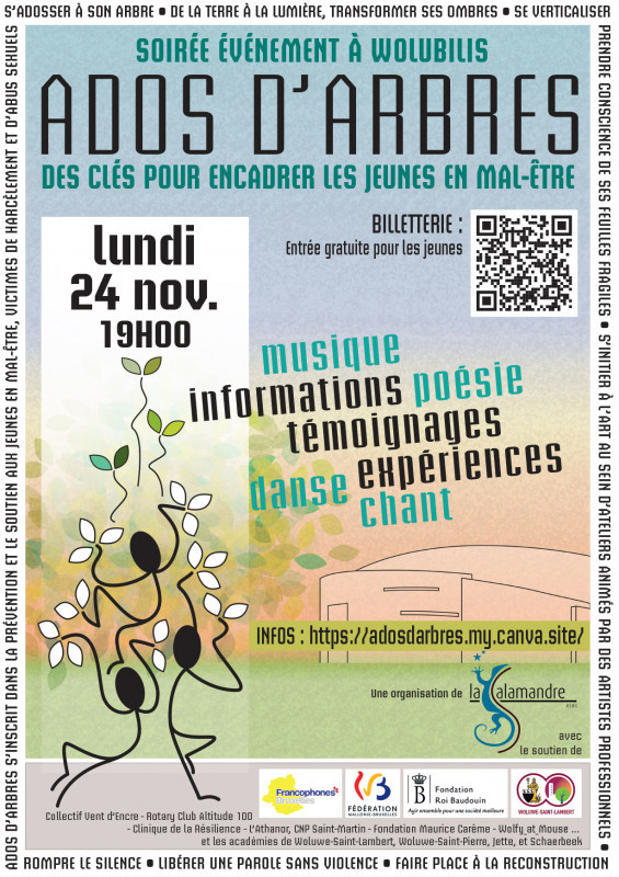 Lors de la soirée, l’information (témoignages et partages d’expérience) alternera avec des moments artistiques multiples et interactifs, prestés par des jeunes ou des artistes professionnels. L’objectif est de présenter, dans un esprit positif et constructif ce qui existe pour entourer les jeunes en mal-être en Fédération Wallonie-Bruxelles et notamment dans la Commune de Woluwe-Saint-Lambert.