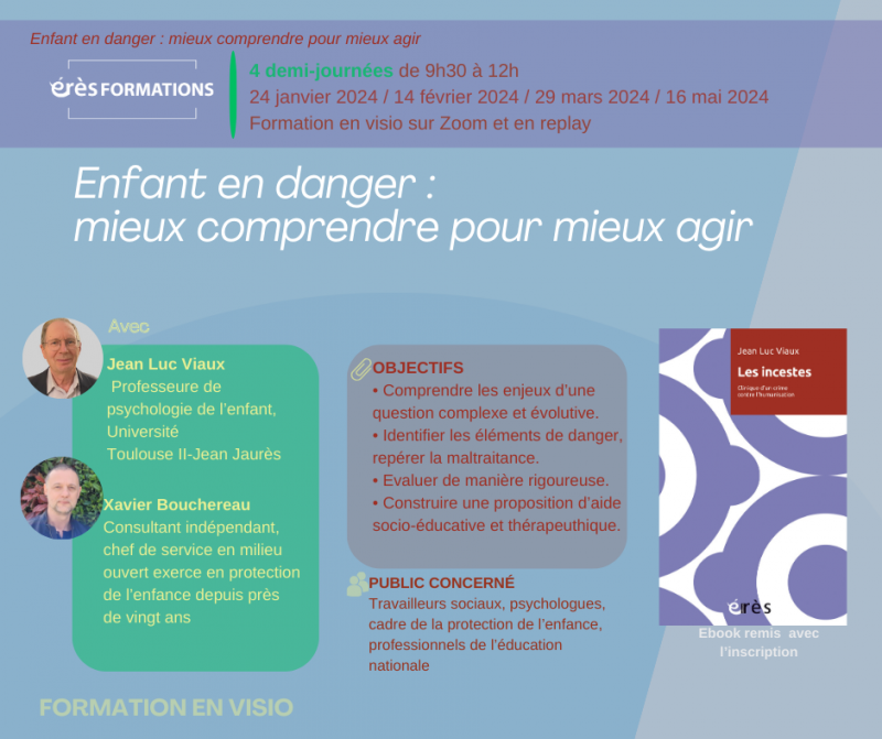 Comment repérer et protéger un enfant en danger ? Que recouvre cette notion de danger : carence, défaut de soin, maltraitance grave… La notion de danger nécessite de lever les ambiguïtés qui l’entourent, ambiguïtés qui peuvent brouiller la pensée et parasiter l’action. Il s’agit donc de mieux différencier les problématiques, d’en comprendre les enjeux, les mécanismes et les effets sur les enfants qui en sont victimes. Cette formation, animée par un Docteur en psychologie expert auprès des tribunaux et un professionnel de la protection de l’enfance, propose de poser les bases d’une évaluation rigoureuse afin d’explorer collectivement les réponses thérapeutiques et éducatives possibles pour protéger l’enfant et soutenir ses parents chaque fois que les conditions le permettent.