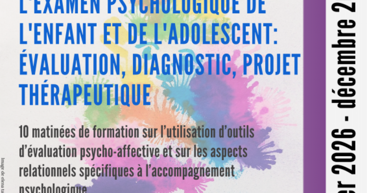Répartie sur 10 samedis matins tout au long de l’année 2026, cette formation vise à développer les compétences du clinicien travaillant avec les enfants et les adolescents à la fois sur l’utilisation d’outils d’évaluation psycho-affective et de médiums thérapeutiques, ainsi que sur les aspects relationnels spécifiques à l’accompagnement psychologique.