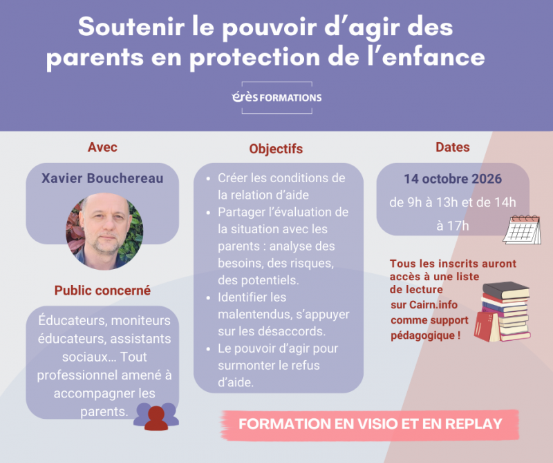 Les parents sont les premiers éducateurs de l'enfant, ceux qui lui apportent les premiers soins, les premières attentions. Pour diverses raisons, il arrive que cette parentalité vacille, qu’elle défaille. C'est alors que la protection de l'enfance intervient, en soutien. Mais ce soutien n'a rien d'une évidence, l'aide proposée se heurte bien souvent au narcissisme ébranlé des parents. Face à l’intervention des professionnels, ils peuvent avoir le sentiment d'être délégitimés, dévalorisés, contestés. Certains basculent alors dans une forme de soumission à l’intervention, quand d'autres s'opposent frontalement, refusant l’idée même d’être aidés. Pour les professionnels, toujours le même enjeu : Comment soutenir le pouvoir d'agir de ces parents pour qu’ils occupent de nouveau toute leur place auprès de leur enfant.