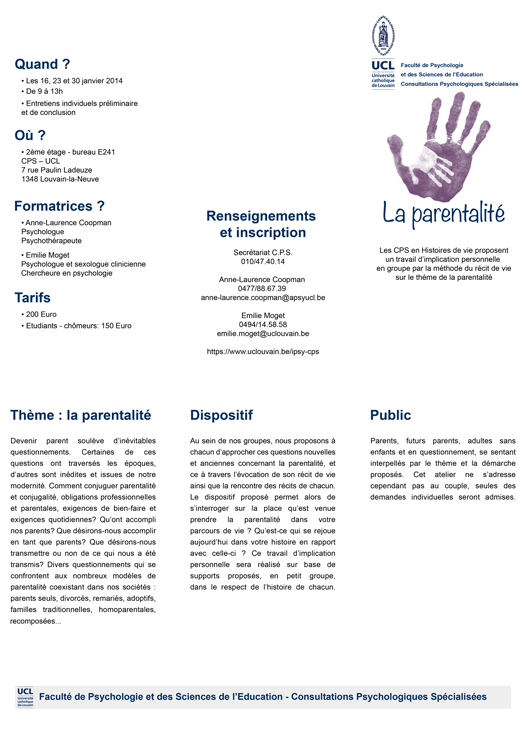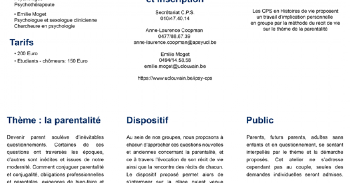 Les Consultations Psychologiques Spécialisées (CPS) en Histoire de vie de l’Université catholique de Louvain proposent un nouveau groupe de travail autour du thème de la parentalité.