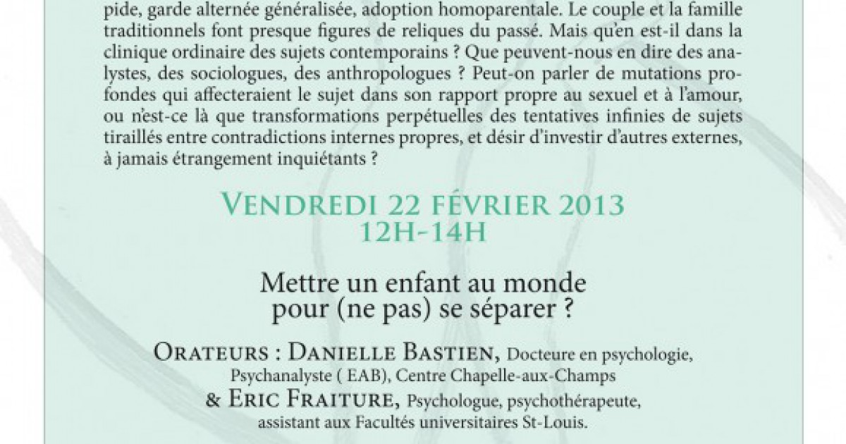 Orateurs : Danielle Bastien, docteure en psychologie, psychanalyste & Eric Fraiture, psychologue, psychothérapeute.