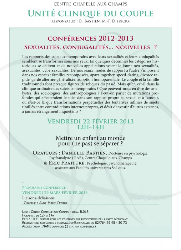 L'Unité clinique du couple du Centre Chapelle-aux-Champs vous propose une conférence sur le thème "Mettre un enfant au monde pour (ne pas) se séparer", le vendredi 22 février 2013, de 12h à 14h.