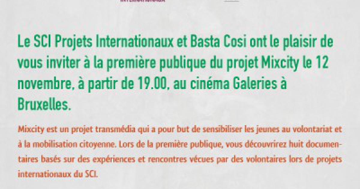 Le SCI Projets Internationaux et Basta Cosi ont le plaisir de vous inviter à la première publique du projet Mixcity le 12 novembre, à partir de 19.00, au cinéma Galeries à Bruxelles.