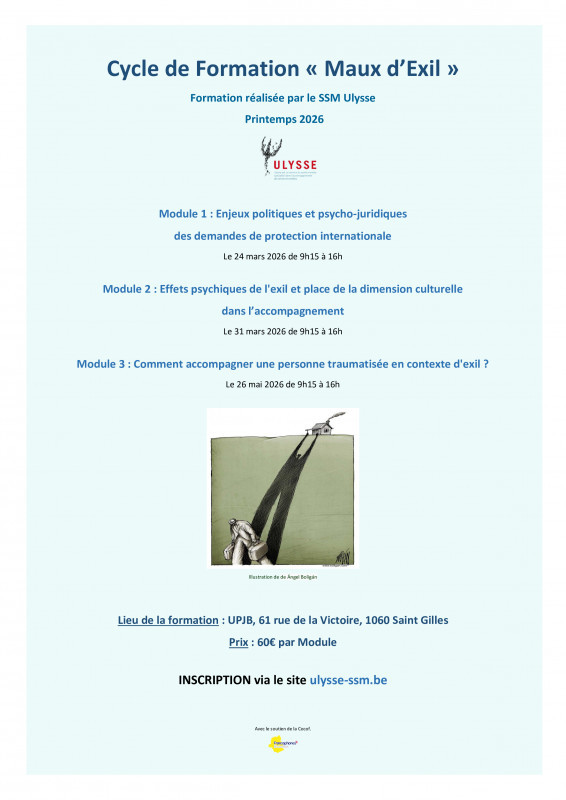 Inscription directe sur le site du SSM Ulysse via ce lien : https://www.ulysse-ssm.be/event-details/cycle-de-formation-maux-dexil-2