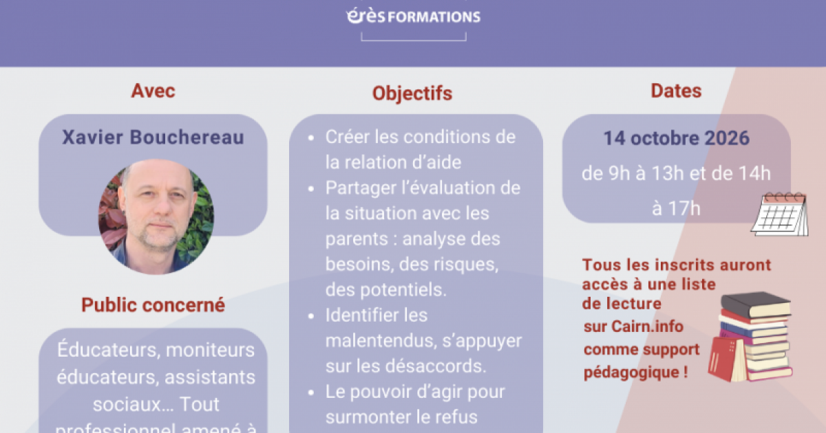 Xavier Bouchereau a exercé pendant 25 ans en protection de l’enfance comme éducateur spécialisé, puis comme cadre. Il est désormais consultant et mène une activité de conseil auprès des institutions sociales, de formateur et est responsable scientifique pour érès Formation. Enfin, il est également auteur. Parmi ses ouvrages : La posture éducative ; les non-dits du travail social, L'éducateur et le psychanalyste, chez érès, et Au cœur des autres (éditions Sciences humaines).